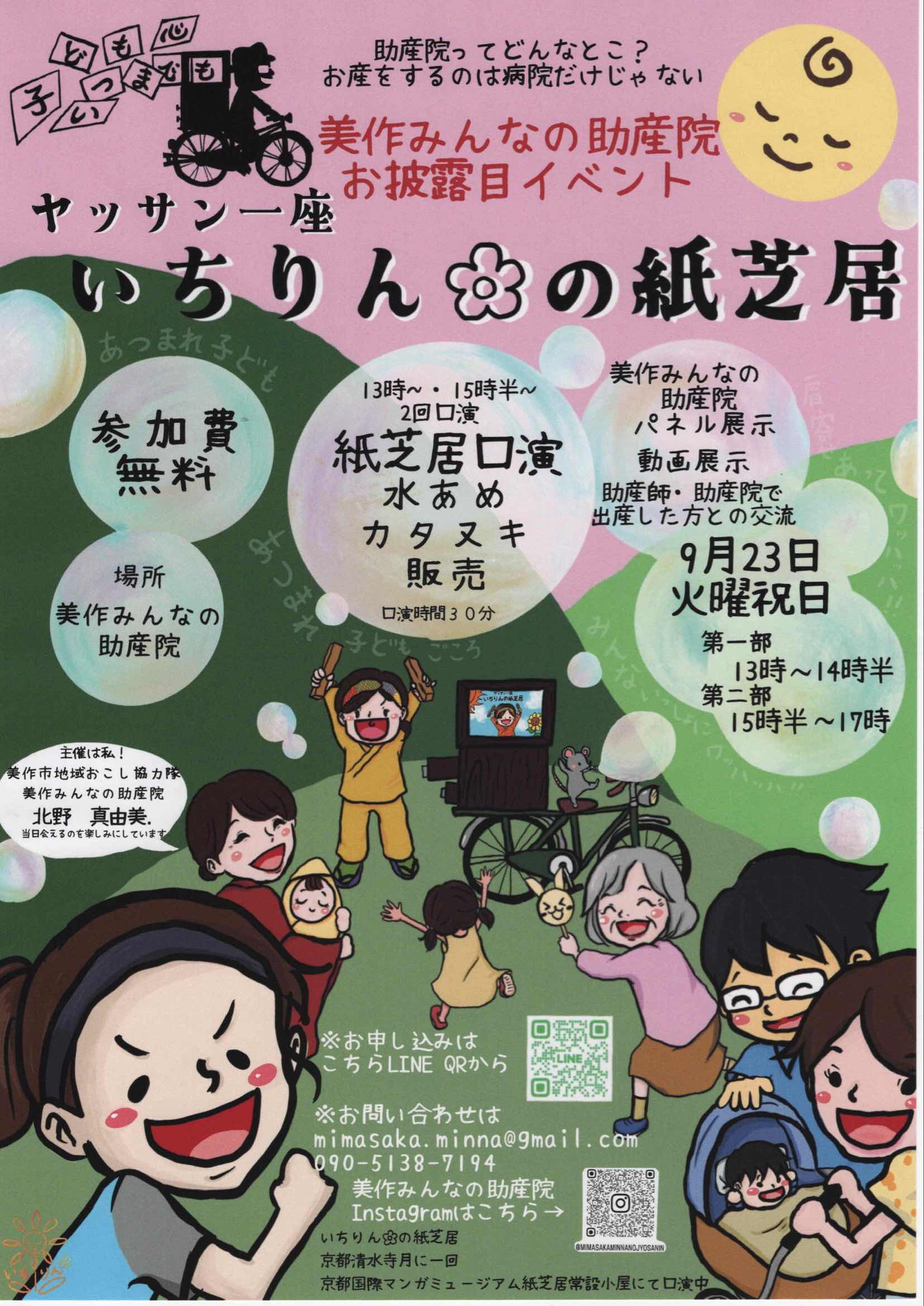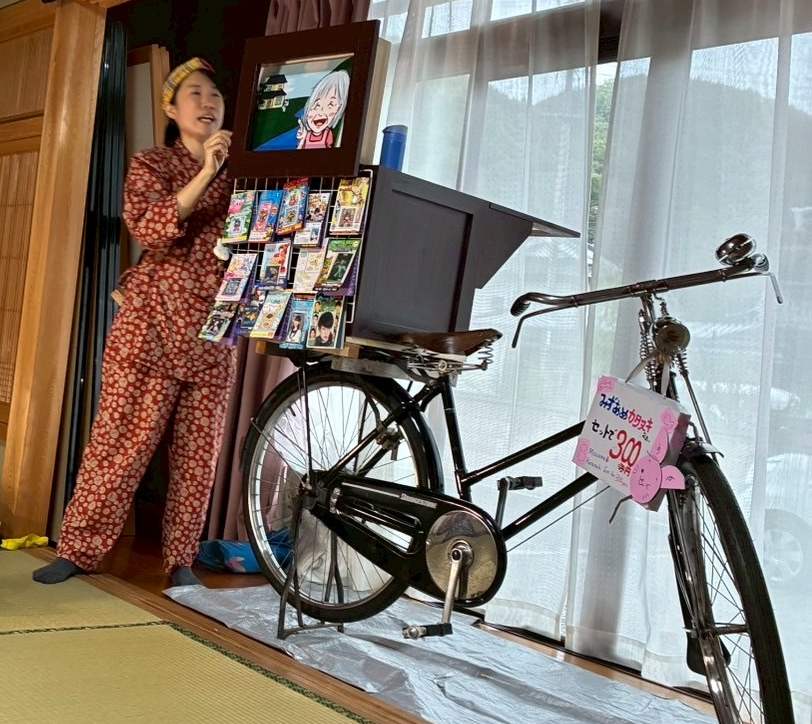 自転車が舞台の昔ながらの紙芝居。 話術にも絵にも、子どもも大人もグッ〜と引き込まれました。第2部の「桃太郎」のお話は、助産院の近くを流れる吉野川で仲良くしていたカップルに新たないのちが宿り、助産院で生まれるお話でした。 改めて、美作みんなの助産院は「お産から日本の文化を取り戻す」助産院であることを認識する会にもなりました。